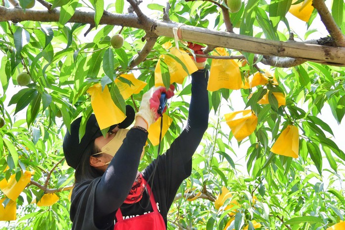 | ▲복숭아 봉지 씌우기 작업에 함께 하고 있는 장성군 봉사단원 (사진=장성군) |