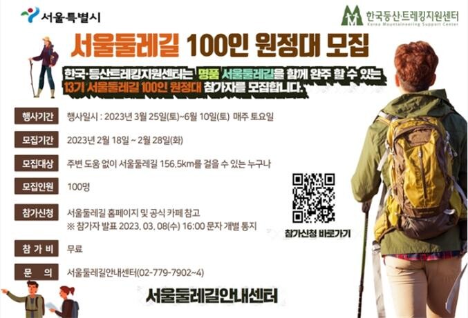 서울특별시는 매주 토요일마다 숲길등산지도사 등 전문가와 함게 걷는 ‘서울둘레길 100인 원정대’참여자를 모집한다.
