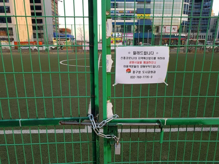 | ▲ 중구 풋살장에 시설폐쇄 알림장이 붙어있다. (사진=인천 중구청 제공) |