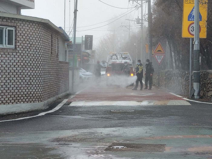 코로나19 확산방지를 위한 방역을 위해 군부대는 제독차량(1대)과 급수차량(1대)을 지원했고, 119안전센터는 소방 펌프차량(1대), 면사무소는 다목적 방제차량(1대)·1톤 트럭(2대)·급수차량(1대)· 자동분무기(2대) 등 모두 9대의 장비가 동원됐다.