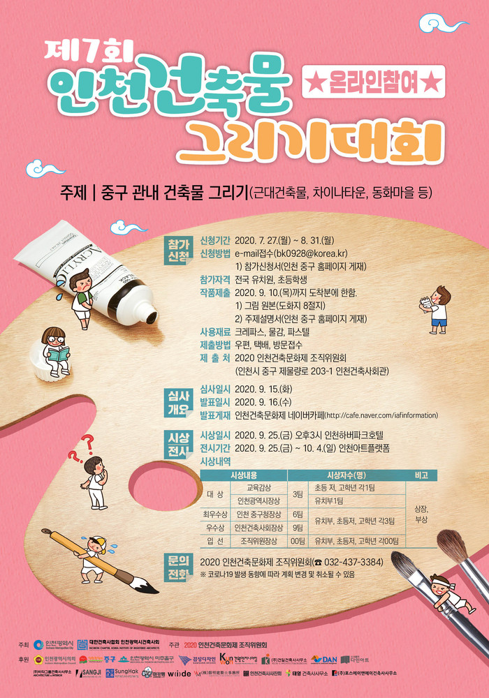 심사 및 시상은 9월 중 유치부·초등 저학년·초등고학년부로 나눠 대상 3팀·최우수상 6팀·우수상 9팀 등을 선발해 시상하고 수상작은 인천아트플랫폼에 전시할 계획이다.