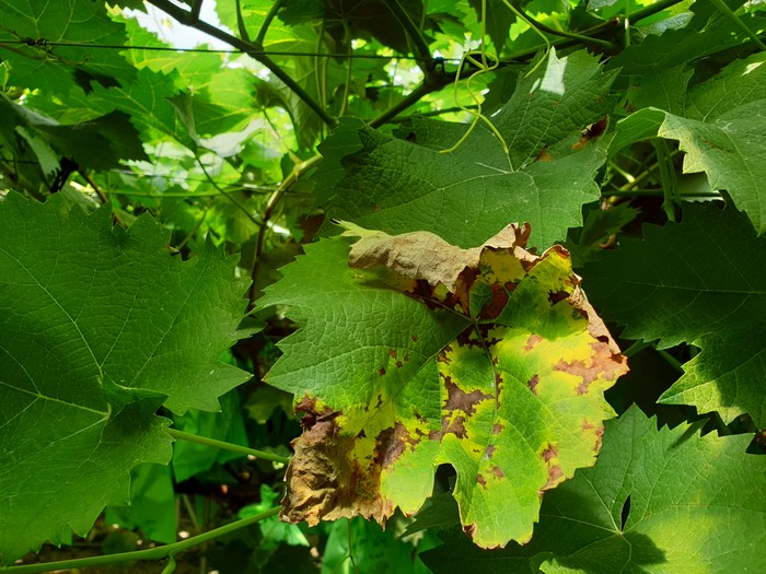 | ▲ 노균병에 감염된 샤인머스켓. (사진=경북도 제공) |