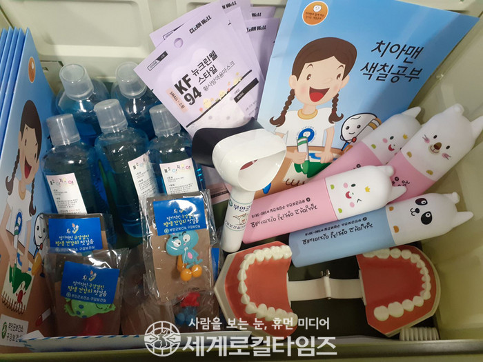 딜리버리 박스는 잇솔질 교습을 위한 치아모형, 치아세균체크기(덴티노트), 치면착색제 도포를 통한 프라그 체크, 치아교육을 돕는 색칠공부 홍보물 등 10여 가지의 교육물품으로 구성돼 있다.