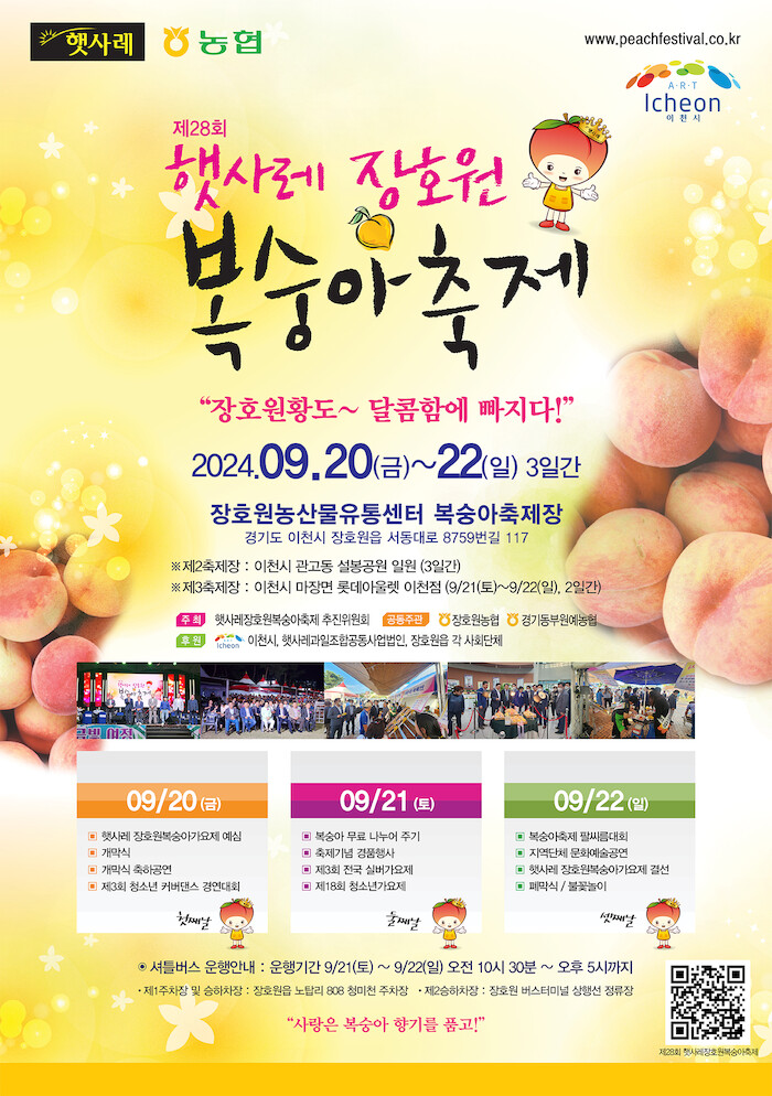 [세계로컬타임즈 온라인뉴스팀]이천시는 오는 9월 20일 금요일부터 9월 22일 일요일까지 3일 동안 장호원 햇사레 농산물 산지유통센터 복숭아축제장에서 ‘장호원 황도~ 달콤함에 빠지다!’라는 주제로 ‘제28회 햇사레 장호원복숭아축제’를 개최한다고 밝혔다.