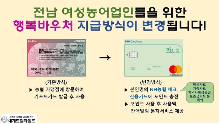 [세계로컬타임즈 문형원 기자] 전라남도는 여성 농어업인의 삶의 질 향상을 위해 매년 1인당 20만 원씩 지원하던 행복바우처 지급 방식을 기존의 선불식 기프트카드 지급에서 본인 명의 카드에 포인트 충전 방식으로 변경한다고 밝혔다.
