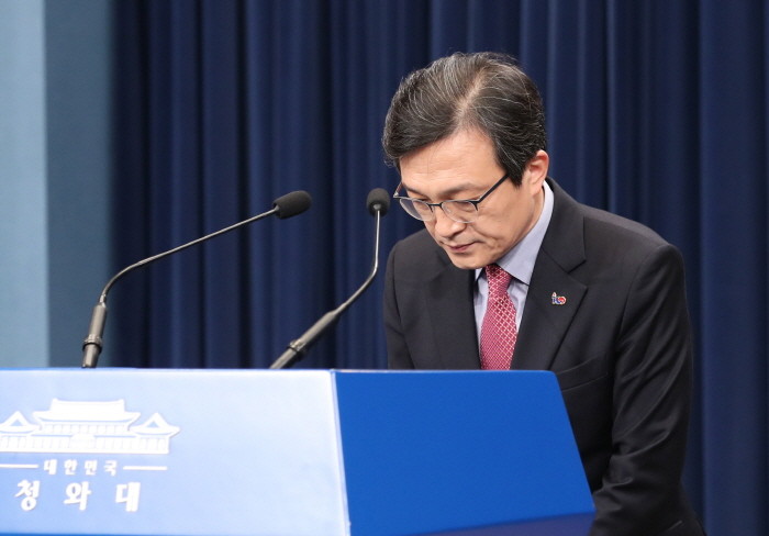 | ▲ 청와대 김의겸 대변인이 지난 8일 청와대 춘추관에서 정부 부처 7곳에 대한 개각 발표에 앞서 인사하고 있다.(사진=뉴시스) |