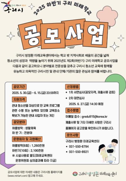 하반기‘구리 미래학교’ 의 여름방학 특강은 7월 19일부터 8월 18일까지, 하반기 교육은 9월 13일부터 12월 7일까지 진행한다.