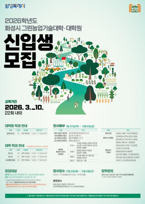 [세계로컬타임즈] 화성특례시가 지역 농업의 지속가능한 성장을 이끌 전문 인재 양성에 나선다. 시는 ‘2026년도 그린농업기술대학(원)’ 신입생을 모집한다고 22일 밝혔다.
