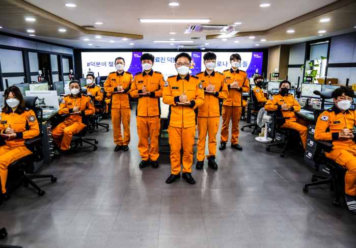 | ▲ 대구소방의 컨트롤타워인 119종합상황실에서 대원들이 ‘덕분에 챌린지’ 캠페인에 동참하고 있다.(사진=대구소방안전본부 제공) |