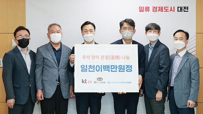 [세계로컬타임즈 민순혜 기자] KT 자회사인 케이티씨에스(KTcs) 박경원 대표는 5일 대전시청을 찾아 추석을 맞아 대전시자원봉사연합회에 1,200만 원을 기탁했다. 기탁식에는 김영태 대전시자원봉사연합회장, 이택구 대전시 행정부시장이 함께했다.