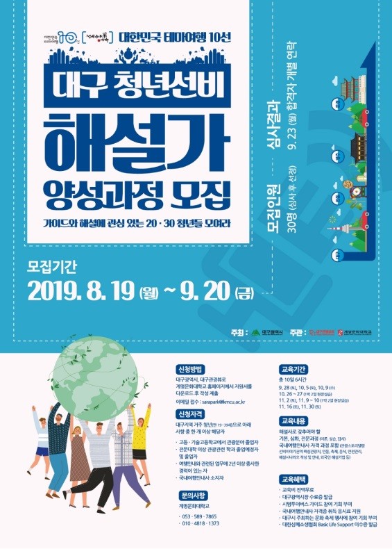 이 과정은‘대한민국 테마여행 10선 사업’의 일환으로 추진하는 것으로서, 대구지역에 거주하는 20·30대 위주로 선발해 청년 일자리 창출에도 기여할 것으로 보인다.