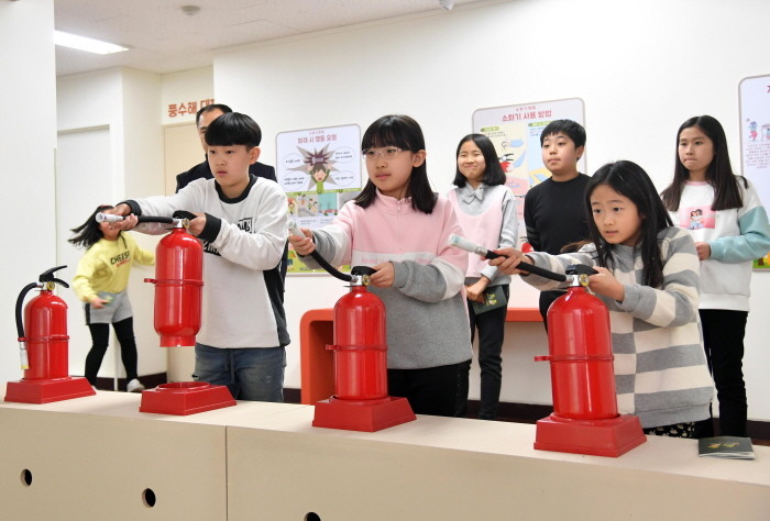 | ▲부산지역 첫 교실형 안전체험관인 부산 와석초등학교 어울림 안전체험관에서 어린이들이 소화기 사용법 체험을 하고 있다. (사진=뉴시스) |