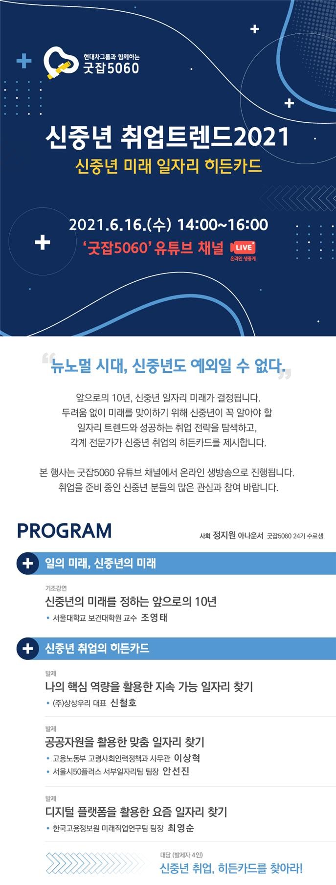 ‘신중년 취업트렌드2021’ 온라인 세미나는 오는 6월 16일 오후 2시부터 유튜브 채널을 이용해 생중계되며, 26일부터 50+포털에서 사전 등록 신청을 받는다.