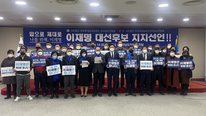 [세계로컬타임즈 김명진 기자] 한국농업경영인 전남연합회와 여성농업인 전남연합회는 지난 27일 오후 2시 전남도의회 초의실에서 ‘더불어민주당 이재명 대통령 후보 지지선언’ 행사를 갖고 20대 대선에서 이재명 후보 지지를 엄숙히 선언한다고 밝혔다.