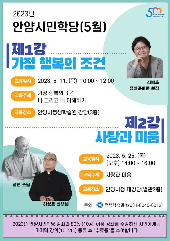 최대호 안양시장은 “행복도시 완성을 위해 저명 인사 초청 시민학당 특강 시간을 마련했다”며 시민들의 많은 참석을 당부했다.