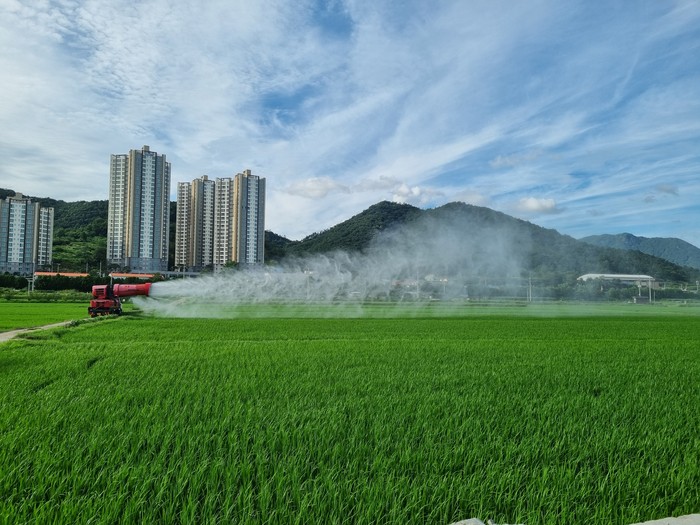 | ▲ 화순군이 12월 말까지 친환경인증 농가에 5개 사업 지원금 총 26억5000만 원을 지급한다. 사진은 화순읍 벽라단지의 친환경농업단지 조성을 위한 공동방제 모습(사진=화순군) |