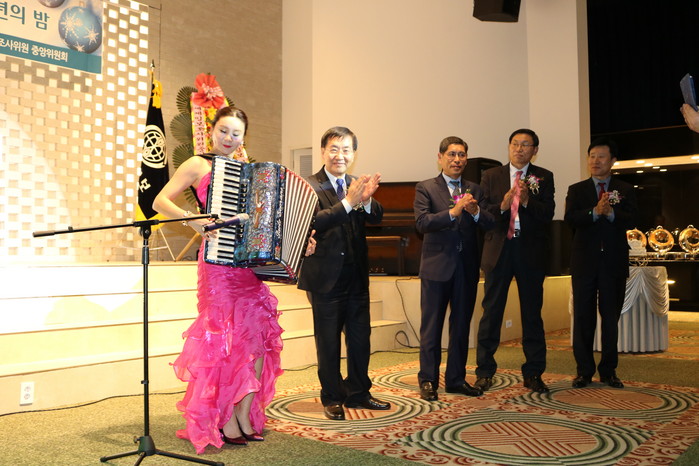 | ▲ 12일 열린 세계일보 조사위원 서울시상임위원회 송년의 밤 행사에 초청된 평양민속예술단 가수가 아코디언을 연주하고 있는 가운데 차준영 사장과 최광배 서울시 상임위 수석부회장, 이주영 서울시 상임위 상임고문, 김중석 서울시 상임위 사무총장이 박수를 치며 즐기고 있다. |