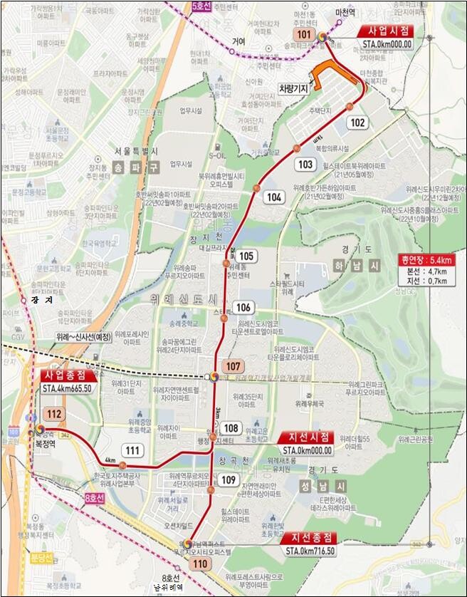 위례선(트램)은 서울 남동부 송파구 남쪽에 있는 대규모 신도시인 위례신도시의 교통난 해소 및 대중교통 편의성을 높이기 위해 마천역(5호선)에서 복정역(8호선‧수인분당선)과 남위례역(8호선)까지 총 연장 5.4㎞을 트램으로 연결하는 친환경 신교통 사업이다.