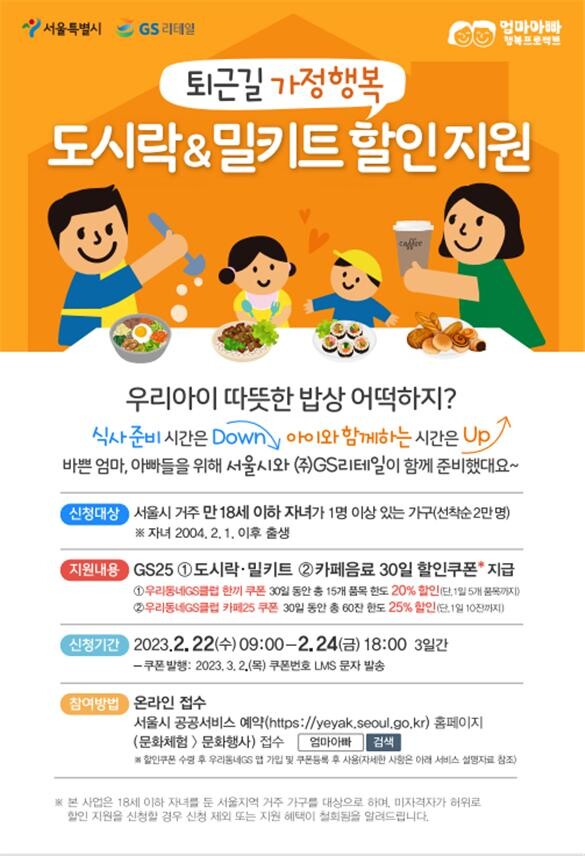 엄마·아빠가 퇴근 후 아이와 더 많은 시간을 보내도록 도시락, 밀키트 등을 20% 할인된 가격에 살 수 있게 지원한다.