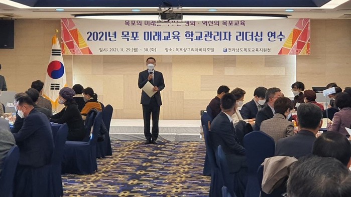 [세계로컬타임즈 김명진 기자] 목포교육지원청은 11월 29일~30일 샹그리아비치호텔에서 교(원)장과 교(원)감을 대상으로 '2021 목포 미래교육 학교관리자 리더십 연수'를 개최했다. 이번 연수는 학교관리자로서의 리더십을 발휘하는 방법을 배우고 새로운 리더십을 통해 구성원들의 자발성을 끌어내기 위해 마련한 자리다.