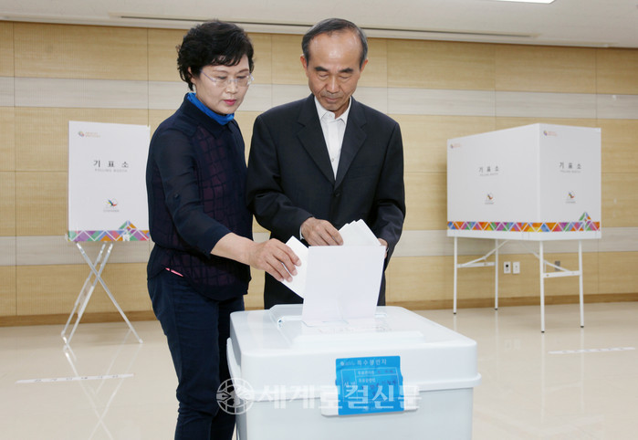 [세계로컬신문 조주연 기자] 박준배 더불어민주당 김제시장 후보 내외가 8일 오전 전북 김제시 검산동 주민센터에 마련된 사전투표소를 찾아 투표했다.