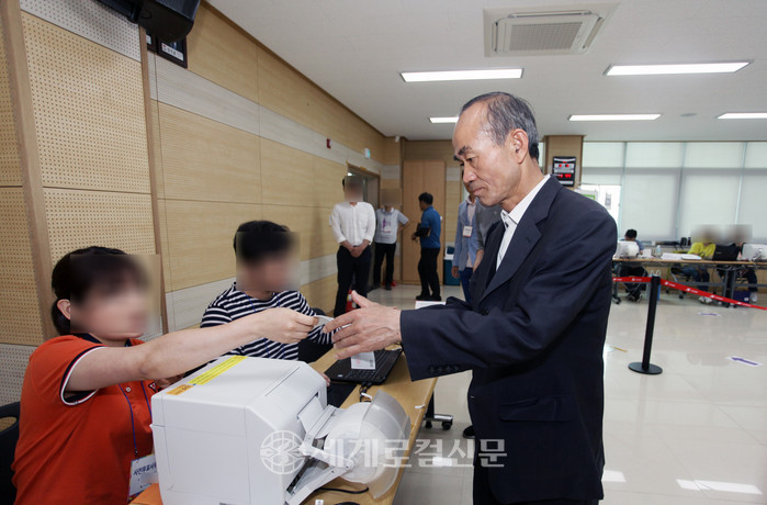 | ▲ 8일 오전 사전투표를 하기 위해 김제시 검산동 사전투표소를 찾은 박준배 김제시장 후보가 선거 사무원으로 부터 투표용지를 건네받고 있다. |