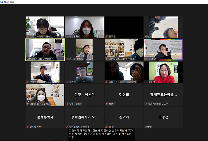 [세계로컬타임즈 민순혜 기자] 대전광역시의회가 주최하고 교육위원회가 주관하는 ‘장애인 생애주기별 돌봄 지원방안 모색 정책토론회’가 9일 오전 비대면 화상회의로 개최됐다.
