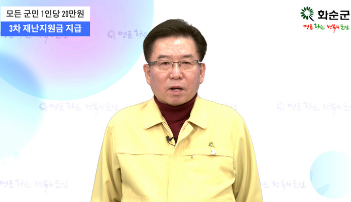 구충곤 화순군수는 24일 담화문을 통해 “코로나 장기화로 어려움이 가중되고, 계층과 분야를 가리지 않고 그 고통이 커지고 있다”며 “군민 생활안정과 경제 활성화를 위해 3차 화순군 재난지원금을 지급하겠다”고 밝혔다.