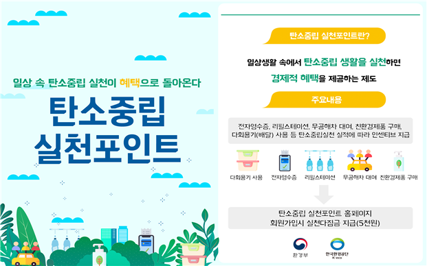 지난달 19일부터 새롭게 시행된 탄소중립 실천포인트제는 전자영수증 발급, 리필스테이션 이용, 다회용기 사용, 무공해차 렌트, 그린카드로 친환경상품 구매하기 등 이중 하나만 참여해도 실천다짐 지원금으로 5000원이 지급되며 1인당 연간 최대 7만원을 적립 할 수 있다.