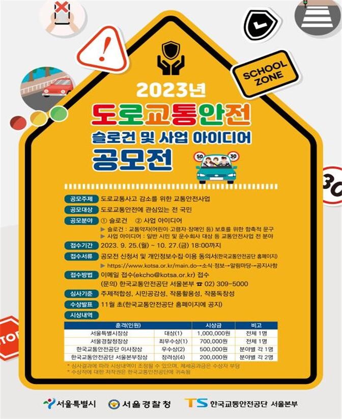 [세계로컬타임즈 이효진 기자] 서울시는 서울경찰청, 한국교통안전공단과 함께 오는 27일까지 전 국민을 대상으로 ‘도로교통안전 표어(슬로건) 및 사업 아이디어 공모전’을 개최한다.