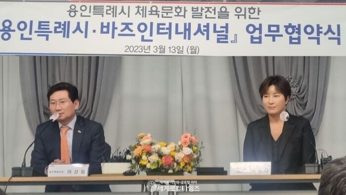 이상일 용인시장과 박세리 ㈜바즈인터내셔널 대표는 13일 용인시청 컨벤션홀에서 ‘용인시 체육문화 발전을 위한 업무협약’을 체결했다.
