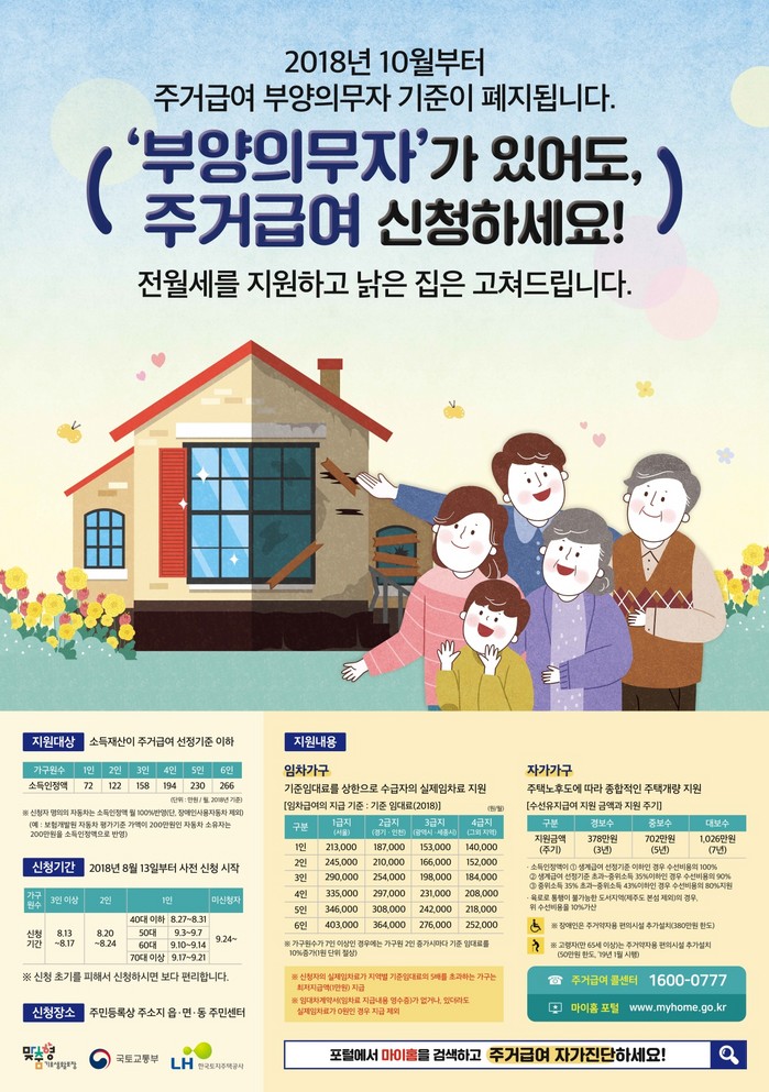 그러나 오는 10월부터 부양의무자 기준이 폐지되면서 부양의무자로 인해 주거급여 대상에서 제외됐던 저소득층도 지원받을 수 있게 됐다.