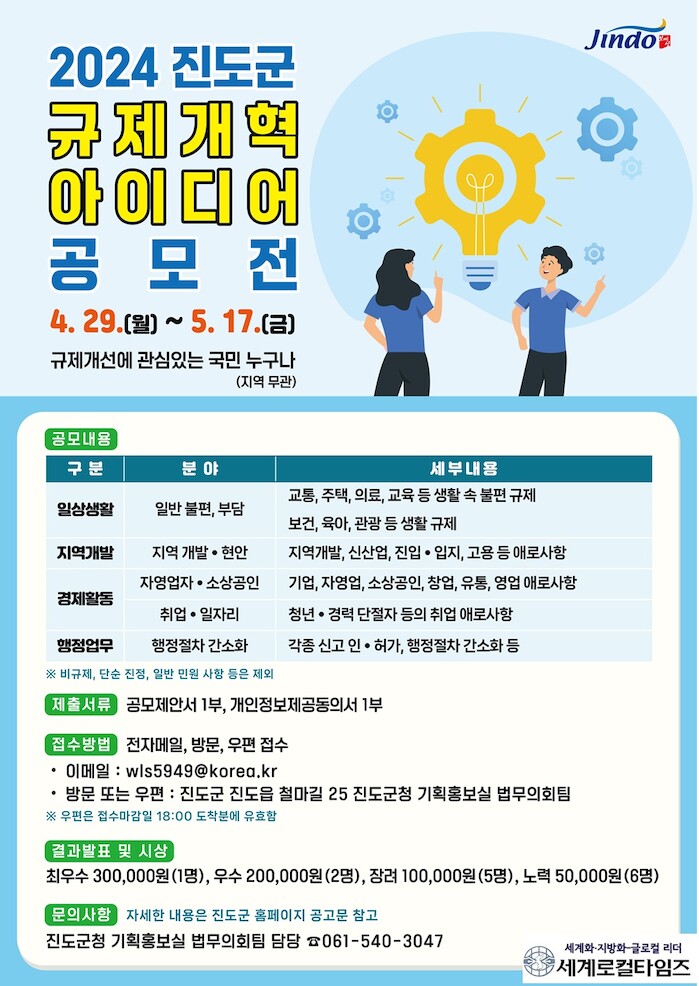 [세계로컬타임즈 문형원 기자] 진도군이 전 국민을 대상으로 ‘2024 규제개혁 아이디어 공모전’을 개최한다.