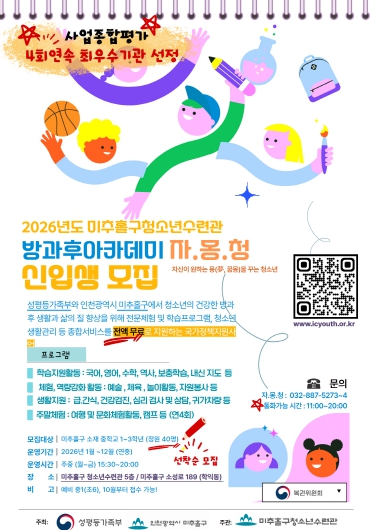 한편, ‘자·몽·청’은 성평등가족부와 미추홀구가 함께 운영하는 국가정책 지원사업으로, 청소년의 방과후 생활과 학습, 문화 활동을 종합적으로 지원하고 있다.