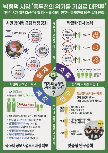 박 시장의 또 다른 협치 행보도 눈길을 끈다. 지난해 우정사업본부는 동두천우체국을 양주우체국 소속국으로의 전환을 계획했다. 이에 곧바로 우정사업본부, 경인지방우정청에 동두천·양주 통합 반대 건의서를 발송하였으며, 사회단체와 협력하여 적극적인 의견을 피력해 동두천우체국 총괄국 지위를 지켜냈다.