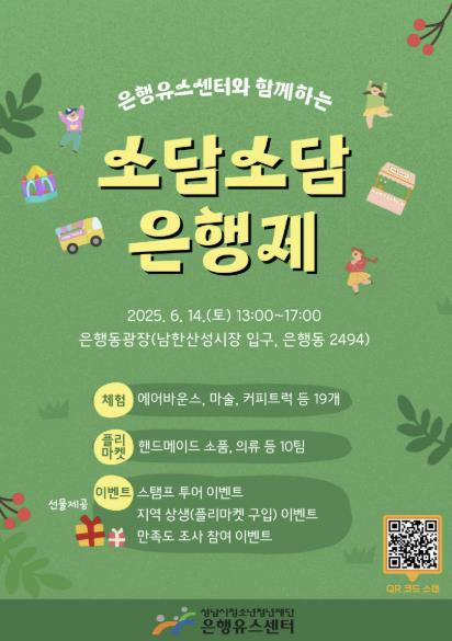 ‘소담소담 은행제’는 30여 개의 체험 부스 및 청년 플리마켓이 운영된다. 축제에는 청소년과 유관기관이 운영하는 다양한 체험거리뿐 아니라 에어바운스, 마술 체험, 커피트럭 등이 운영되며, 남한산성시장 상인회가 주관하는 스탬프 투어와 만족도 조사 참여 이벤트 등이 진행될 예정이다.