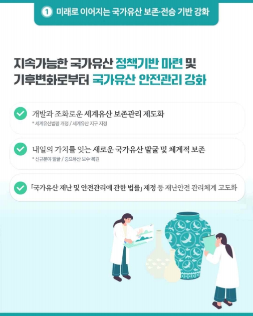 문화·자연·무형유산 각 유형별 특성에 따라 맞춤형 보존·관리를 추진하여 유산의 가치를 지켜나갈 것이다. 문화유산 수리 시, 실측설계기술자가 지속적으로 참여하는 ‘책임설계’를 도입해 수리 품질을 높이고, 공영수리 확대와 전통재료 비축을 통해 민간에서 주도하기 어려운 분야에 대한 공공지원을 강화한다. 또한, 올해로 준공 100주년을 맞은 '구 서울역사'의 철도유산으로서의 정체성과 역사(驛舍)로서의 주변시설 기능 연계·회복을 위한 보수·복원도 추진한다.
