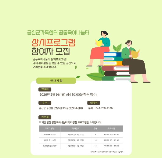 군 관계자는 “이번 프로그램에 취미활동을 함께하며 육아의 부담을 덜 수 있을 것”이라며 “주민들의 많은 관심을 바란다”고 말했다.