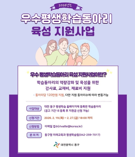 신청은 오는 27일 오후 6시까지 담당자 전자우편으로 하면 되며, 자세한 사항은 대전 동구 평생학습 누리집 공지사항에서 확인할 수 있다.