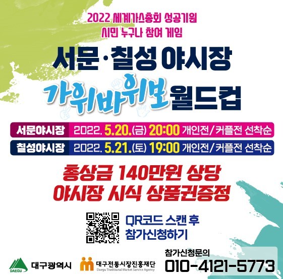 ‘붙어보자 가위바위보! 월드컵’은 사전 예약 및 현장 참여 신청 인원을 대상으로 5월 22일 금요일 서문야시장, 5월 21일 토요일 칠성야시장에서 각각 펼쳐진다.