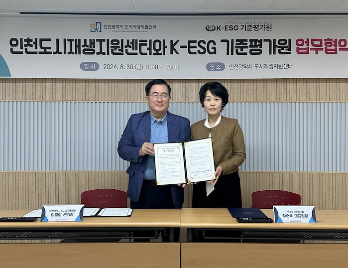 [세계로컬타임즈 이효진 기자]인천광역시 도시재생지원센터는 지난 30일 K-ESG 기준평가원과 지속가능한 도시재생과 ESG 실천을 위한 업무협약을 체결했다고 밝혔다.