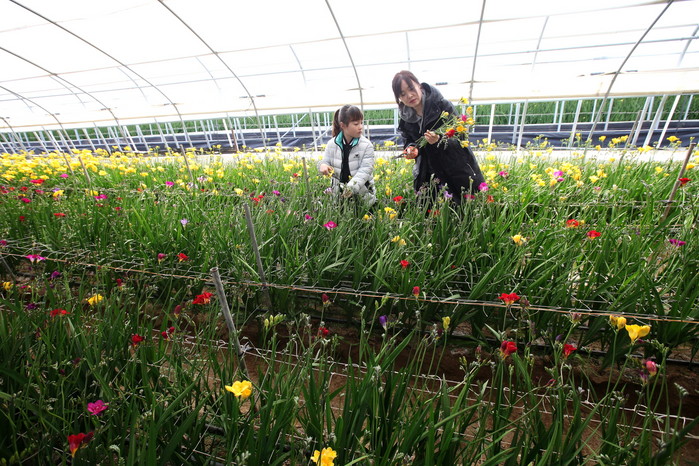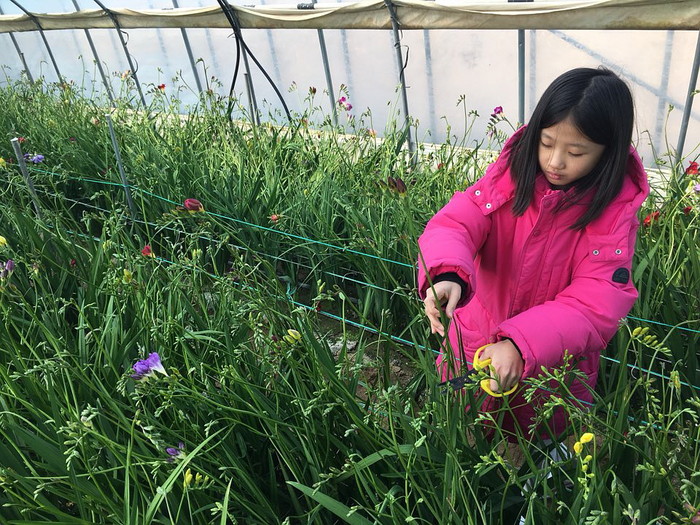 | ▲ 충남 당진 화훼농가들이 프리지어 수확 체험프로그램을 운영하고 있다. 사진은 어린이가 프리지어 수확체험을 하고 있는 모습. |