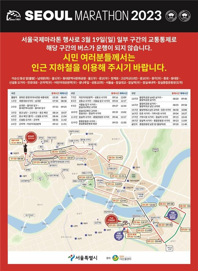 이외에도 각 자치구(종로구, 중구, 성동구, 동대문구, 광진구, 강동구, 송파구), 서울지방경찰청, 소방서, 의료기관 등과 긴밀히 협조해 교통통제로 인한 시민 불편을 최소화하고 대회가 안전하게 진행될 수 있도록 준비한다.