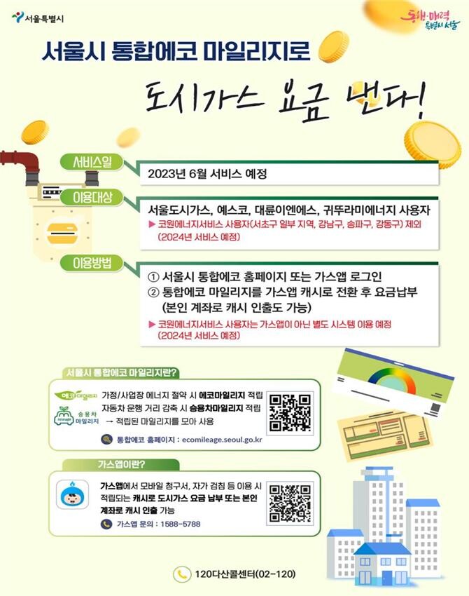 서울시 통합에코 마일리지 회원은 에너지를 절약한 만큼 마일리지를 적립할 수 있고, 도시가스 모바일앱에서 적립된 포인트와 합산해 요금을 납부할 수 있다. 서비스는 시스템 개발과 시범 테스트를 거쳐 6월 말부터 오픈 예정이다.