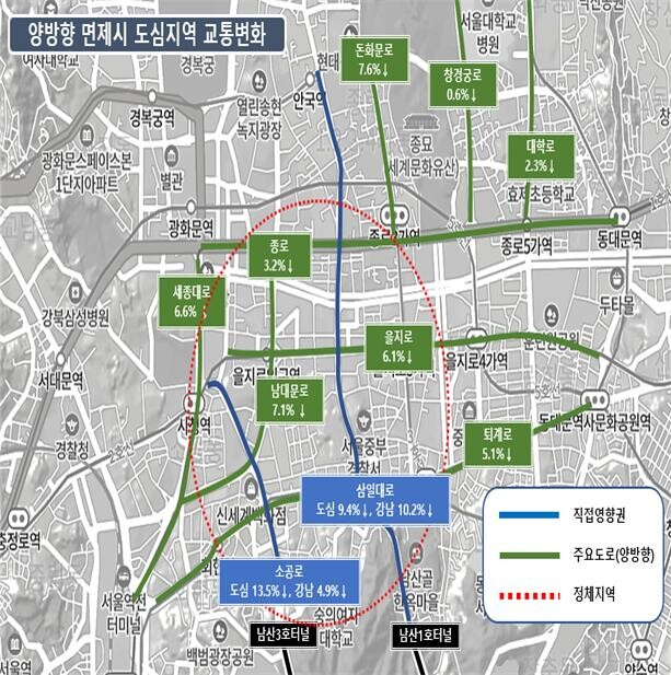 | ▲ 양방향 면제 시 도심지역 교통변화 (사진=서울시) |