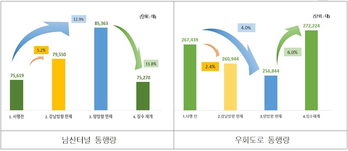 남산터널 통행량은 평시 혼잡통행료 징수시간대 기준으로 75,619대였으나, 강남방향을 면제한 1단계 79,550대로 약 5.2%, 양방향을 면제한 2단계 85,363대로 12.9% 증가했다.