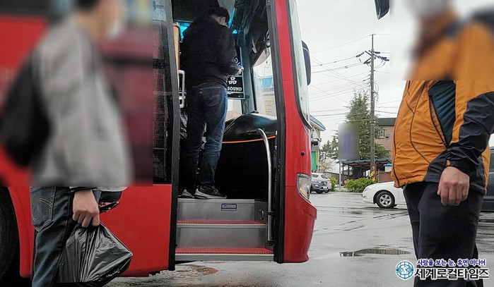 지난 3일 오전, 김제시 한 주차장에 모인 사람들이 빨간색 대형 관광버스에 올라탔다. 흔한 야유회에서 볼 수 있듯 음식 등이 담겨 있을 것으로 보이는 흰색 스티로폼 박스들도 실렸다.