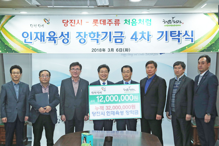 롯데주류는 지난 2015년 당진시와 업무협약을 맺고 당진지역에서 판매된 ‘처음처럼’ 소주 1병 당 30원을 적립해 이번 장학금을 포함해 총 3200만 원의 장학금을 전달했으며 총 2억 원의 장학금을 달성할 때까지 꾸준히 기탁금을 전달할 계획이다.