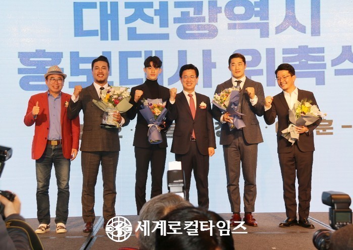 [세계로컬타임즈 오영균 기자] 10일 서울 포시즌스 호텔에서 열린 ‘2019 대전 방문의 해’ 선포식에서 홍보대사로 위촉된 김준호 개그맨과 성악가 바리톤 정경이 허태정 대전시장과 기념사진을 촬영하고 있다.