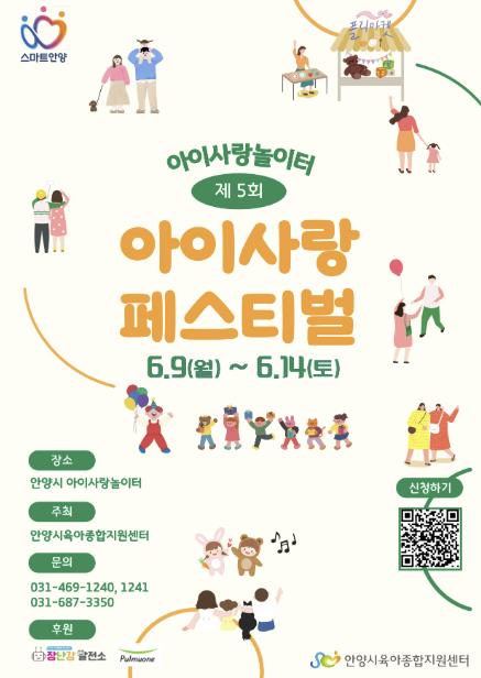 6월 9~14일까지 진행되는 다양한 아이사랑 페스티벌 프로그램은 사전 신청 후 참여할 수 있으며, 프로그램 신청 접수가 안양시육아종합지원센터 홈페이지(육아지원 메뉴)에서 진행 중이다.